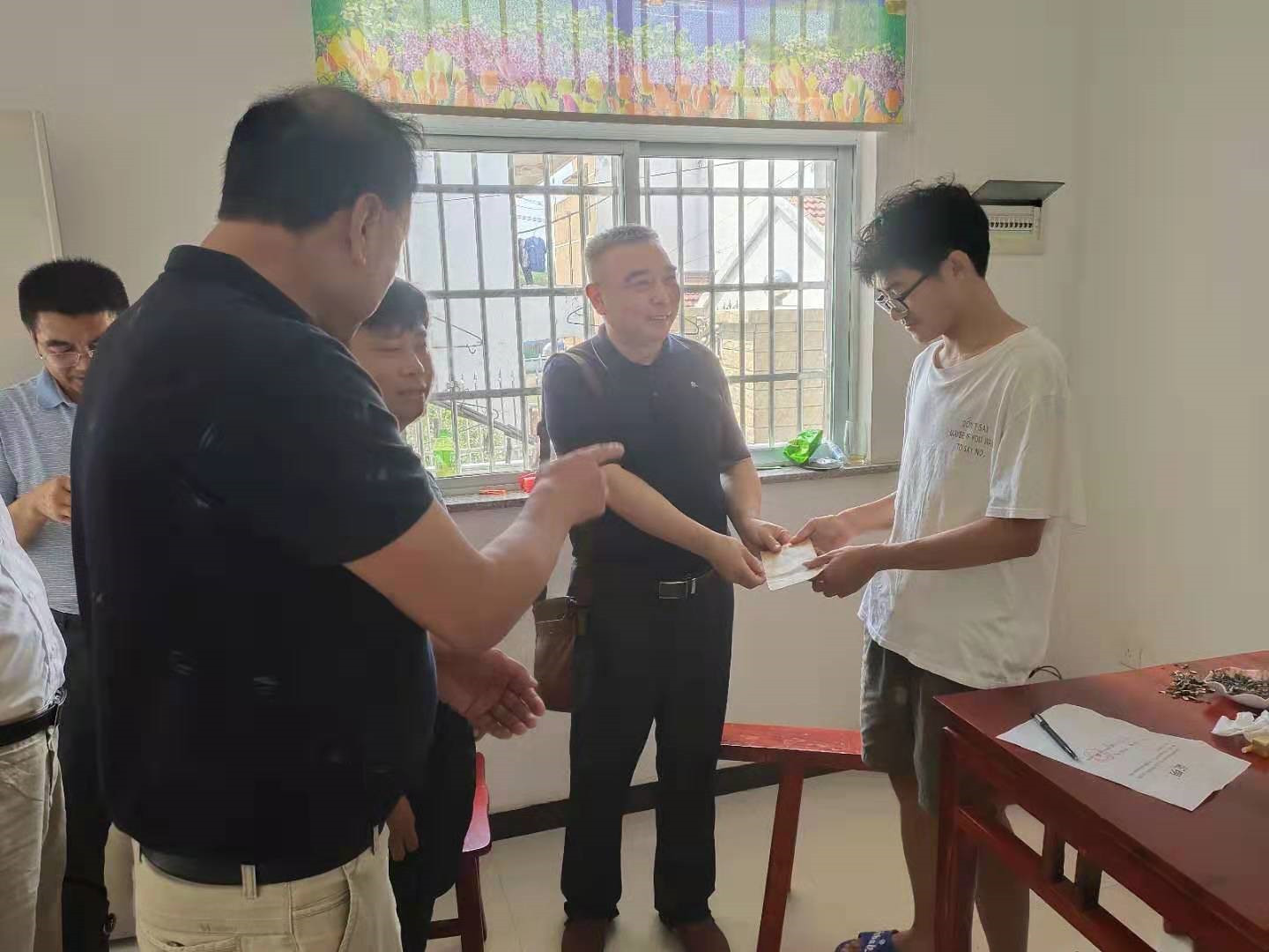 8月21日安庆市中小企业发展促进会会长郑德秀率副会长李华及农业产业开发公司企业负责人一道来到望江县华阳镇鹤庄村进行扶贫对接,与村书记商良座谈村农林产业开发工作,与参会企业进行了有效谋划。会后,促进会对扶贫户家庭考入大学的朱亚南、商俊彤两名学生进行了教育捐款2000元。